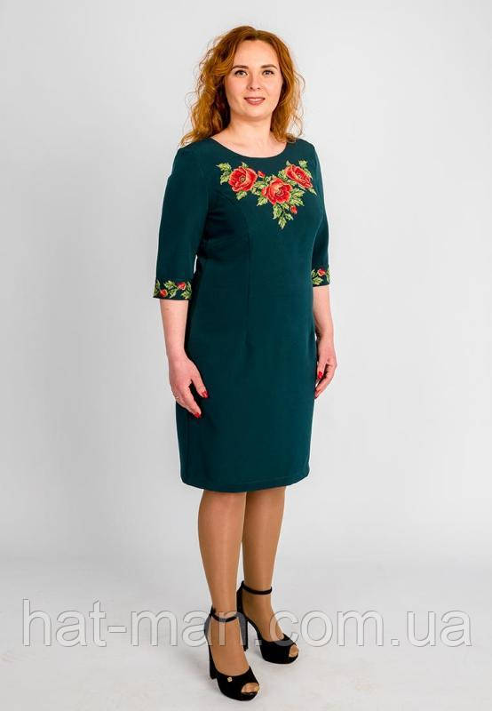 Темно-зелене плаття великого розміру з вишитими трояндами.